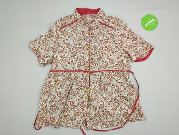 Ta bluzka damska z krótkim rękawem charakteryzuje się kwiecistym wzorem w odcieniach żółci, różu i zieleni na jasnym tle. Posiada kołnierzyk i zapięcie na guziki z przodu, co nadaje jej klasyczny w...Stan: