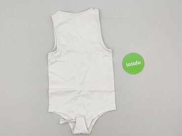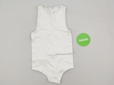 Biały body damskie z elastycznej, gładkiej tkaniny. - Krój: bez rękawów, szerokie ramiączka, głęboki dekolt z przodu i z tyłu, wycięcia przy udach. - Materiał: miękki, rozciągliwy (przyjemny w do...