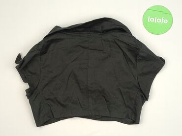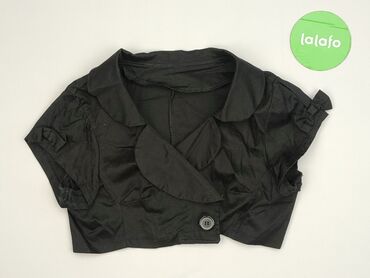 Bolero damskie, krótkie, czarne - Krój: bolerko z otwartym przodem, lekko zaokrąglone poły, krótki rękaw - Rozmiar: M (metka widoczna na zdjęciu) - Materiał: gładka, lekko połyskująca tkanina o sa...