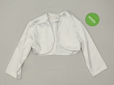 Bolerko damskie ALA – białe, satynowe - Krój: krótkie bolerko z długim rękawem - Fason przodu: otwarty, zaokrąglone poły bez zapięcia - Kołnierz: klasyczny z klapami - Rozmiar z metki: 38 - Materi...