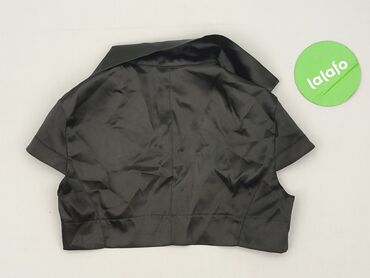 Krótki damski żakiet bolerko, czarny, z lekkim połyskiem. - Krój: bolerko, krótka długość, lekko zaokrąglony dół z przodu - Rękawy: krótkie - Kołnierz: klasyczny, wykładany - Zapięcie: pojedyncza ...