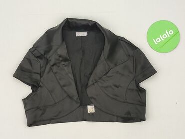 Czarny bolerko/żakiet damski z długim rękawem - Krój: krótkie bolerko, otwarte z przodu (bez zapięcia), zaokrąglone poły - Kolor: głęboka czerń, delikatny, lekko połyskujący materiał - Rękawy: dłu...