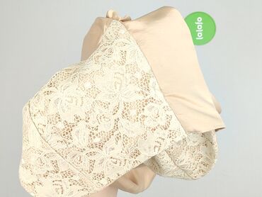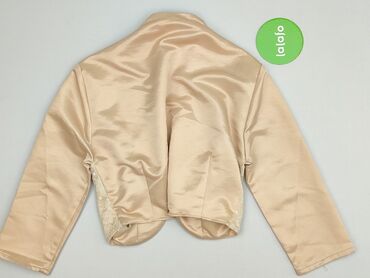 Jasnobeżowe bolero damskie z krótkimi rękawami, idealne jako dodatek do eleganckich kreacji. Charakteryzuje się brakiem zapięcia z przodu oraz dekoltem w kształcie litery V, co nadaje mu lekkości. ...Stan: