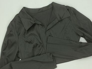 Krótki bolerko/żakiecik damski - Kolor: czarny, satynowy połysk - Krój: krótkie bolerko z krótkim rękawem, szeroki kołnierz/szala, wykrojony przód bez zapięcia - Rozmiar z metki: 34 - Skład materi...