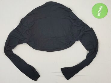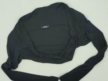 Bolero damskie, krótkie, czarne - Krój: bolerko z otwartym przodem, lekko zaokrąglone poły, krótki rękaw - Rozmiar: M (metka widoczna na zdjęciu) - Materiał: gładka, lekko połyskująca tkanina o sa...