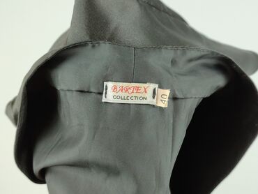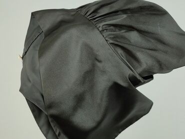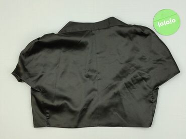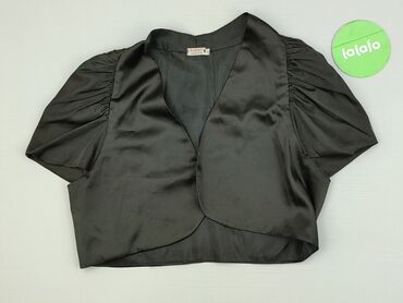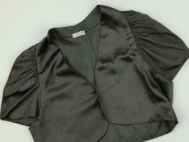 Krótki bolerko/żakiecik damski - Kolor: czarny, satynowy połysk - Krój: krótkie bolerko z krótkim rękawem, szeroki kołnierz/szala, wykrojony przód bez zapięcia - Rozmiar z metki: 34 - Skład materi...