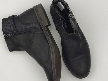 Botki damskie czarne na niskim obcasie - Model: botki/ankle boots z bocznym zamkiem - Kolor: czarny, matowy - Cholewka: miękka, marszczona w przedniej części - Nosek: lekko zaokrąglony, smukły - Z...Stan: