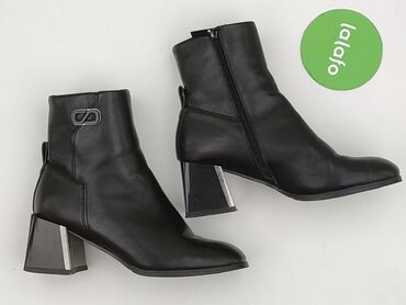 Botki damskie LASOCKI na słupku - Kolor: czarny - Materiał: skóra naturalna (oznaczenie na wkładce) - Cholewka z wycięciami i trzema paskami z metalowymi klamrami po bokach - Zapięcie: suwak z tył...