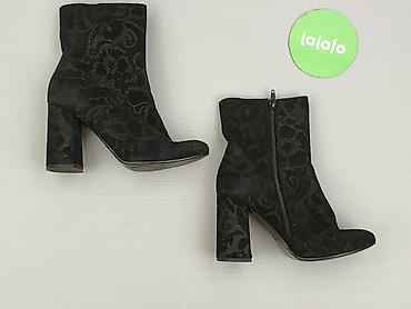 Czarne botki damskie Jenny Fairy, rozmiar 37. - Cholewka: zamszowa/imitacja zamszu - Obcas: gruby słupek ok. 8–9 cm - Nosek: migdałowy - Zapięcie: suwak po boku - Ozdoby: delikatne ćwieki/metalowe...