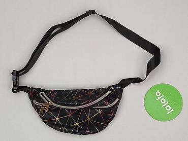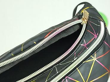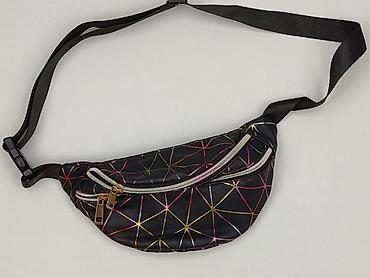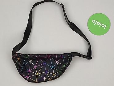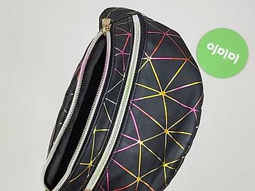 Saszetka nerka damska – czarna z tęczowym, geometrycznym wzorem - Materiał: gładki syntetyk z lekkim połyskiem, łatwy w czyszczeniu - Kolor/wzór: czarne tło, kolorowe linie tworzące efektowną, hol...Typ: