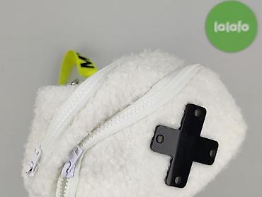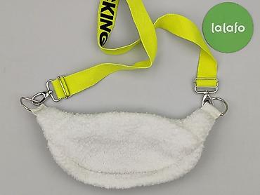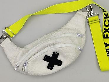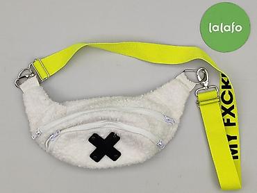 Nerka damska z miękkiego, pluszowego materiału (baranek) w kolorze białym. Model z wyrazistym, neonowo-żółtym, regulowanym paskiem taśmowym z czarnym napisem oraz metalowymi karabińczykami. Z przodu aplikacja w kształcie czarnego krzyżyka.