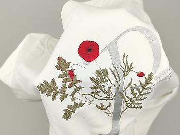 - Przód: nadruk z roślinnym motywem (maki) i dużą literą, subtelny połysk srebrnego elementu