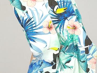 - Wzór: tropikalny print – liście, hibiskusy i tukany w odcieniach zieleni, turkusu, niebieskiego i różu na jasnym tle