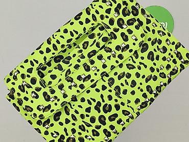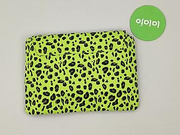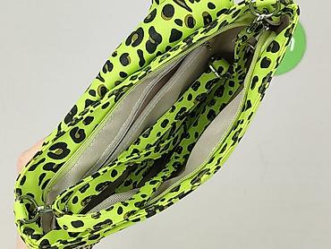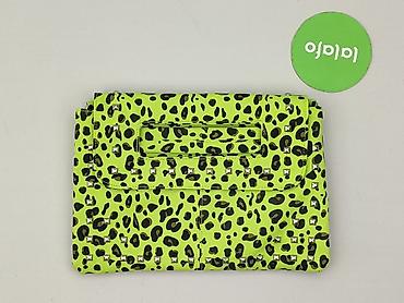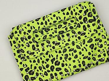 Torebka kopertowa damska w neonowym, limonkowym kolorze z nadrukiem w panterkę i metalowymi ćwiekami. Model z wbudowanym, prostokątnym uchwytem do noszenia w dłoni oraz punktami mocowania dla paska (możliwość przypięcia długiego paska – nie widać w zestawie). Przód z klapą, ozdobiony srebrnymi, kwadratowymi nitami.