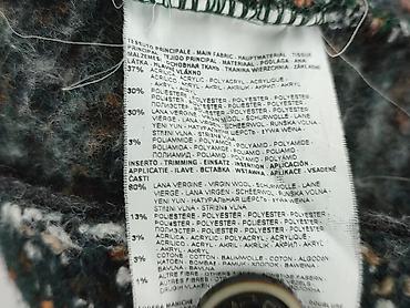 - Kolor: mieszanka melanżowa zieleni z drobnymi akcentami (krem, rdzawy, czarny); rękawy w ciemnej zieleni o wyraźnym, prążkowanym splocie