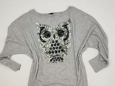 Szary damski sweter/bluza COLLOSEUM, rozmiar S. Luźny fason z obniżoną linią ramion i 3/4 rękawami. Na przodzie duża naszywka z cekinów przedstawiająca sowę – połyskujące srebrne i czarne cekiny tworzą efektowny wzór. Okrągły dekolt, elastyczne ściągacze u dołu i przy rękawach. Miękka, dzianinowa tkanina zapewniająca komfort noszenia. Idealny do casualowych stylizacji z dżinsami lub legginsami. Dla kobiety. Używany.