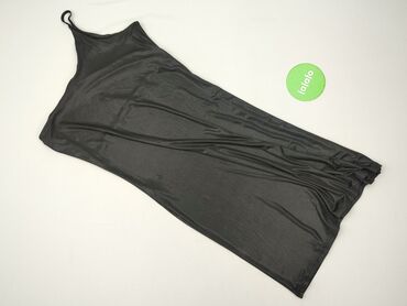 Czarna sukienka damska z lekkiego, zwiewnego materiału. - Fason: bez rękawów, góra z łagodnym dekoltem; w talii wszyta gumka podkreślająca sylwetkę. - Dół: warstwowy, asymetryczny z dłuższymi, s...