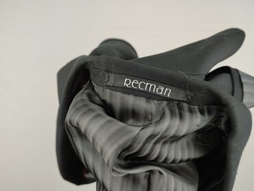 Elegancka, czarna męska marynarka firmy Recman. Posiada klapy w szpic, zapięcie na dwa guziki oraz trzy guziki przy mankietach. Marynarka ma dwie kieszenie z patkami i jedną kieszeń na piersi, a także podszewkę w paski. Idealna na formalne okazje lub do stylizacji biznesowych.