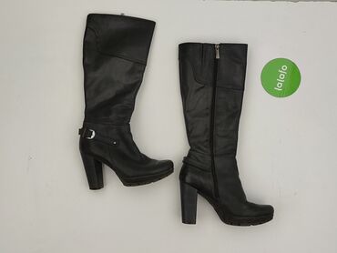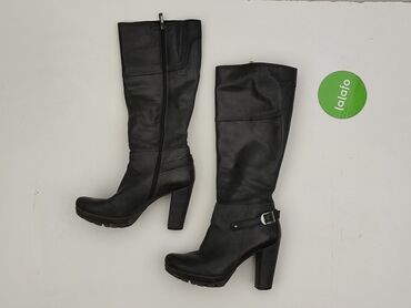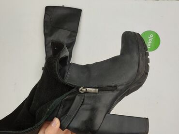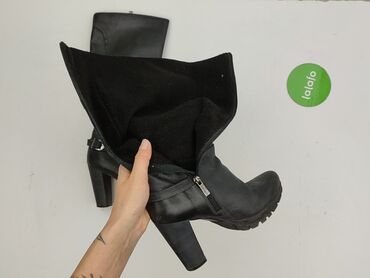 Kozaki damskie za kolano, czarne, zamszowe - Wysoka cholewka z miękkiego zamszu, sięgająca powyżej kolana - Ozdobne aplikacje z metalicznych nitów/kryształków w przedniej części cholewki - Regulow...