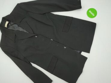 Damska marynarka/żakiet, czarna, krótki fason - Krój: krótki żakiet z dopasowaniem w talii - Zapięcie: 3 duże dekoracyjne guziki z kontrastową obwódką; guziki również przy mankietach - Kołnierz: s...