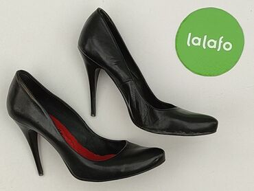 Czarne czółenka na szpilce - Rozmiar: 39 (widoczny na podeszwie) - Obcas: smukła szpilka, ok. 8–9 cm - Cholewka: połączenie materiału matowego z lakierowanymi wstawkami na nosku i pięcie - Nosek: ...