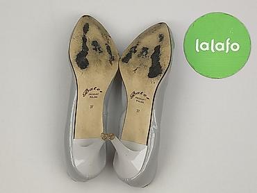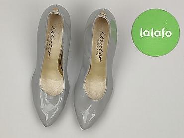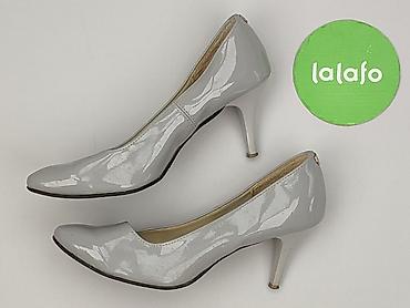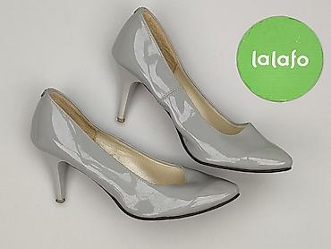 Czółenka damskie na słupku, rozmiar 36 - Kolor: jasnoszary - Materiał cholewki: lakierowana skóra/eko-skóra z połyskiem - Noski: migdałowe, z lakierowanym panelem na przodzie - Zapięcie: pasek z k...