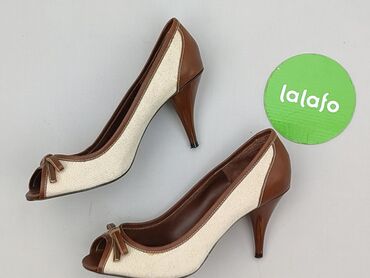 Czółenka peep toe na obcasie - Rozmiar: 37 (oznaczenie na spodzie) - Typ: czółenka z odkrytymi palcami - Obcas: szpilka/słupek ok. 9–10 cm, w kolorze jasnobrązowym - Materiał wierzchni: skóra natu...