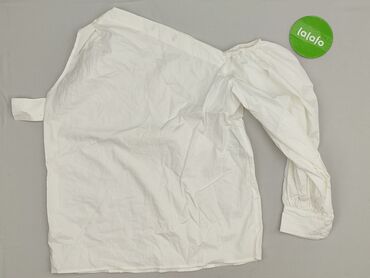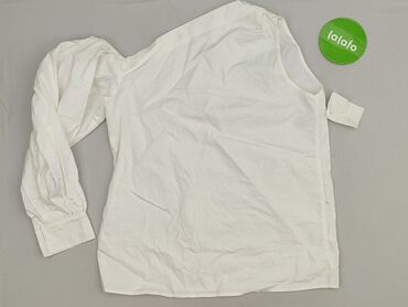 Biała bluzka damska z długim rękawem, asymetryczna (jeden rękaw, drugi bok odkryty). Model z marszczeniem po boku, podkreślającym talię, i lekko przedłużonym, skośnym dołem. Materiał prążkowany, el...