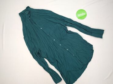 Damska koszula oversize z lekkiej, zwiewnej tkaniny półprzezroczystej. Wzór: abstrakcyjne smugi w kolorze oliwkowej zieleni na czarnym tle. Zapięcie na czarne guziki z przodu. Detal: - kołnierzyk ...Stan:
