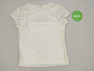Ażurowa bluzka damska w kolorze ecru/kremowym. - Rozmiar z metki: M - Skład: 95% poliester, 5% elastan - Krój: prosty, lekko dopasowany - Dekolt: w kształcie litery V z pęknięciem i guzikiem z tył...