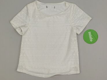 Biała damska bluzka z koronką - Krój: dopasowany, z krótkim rękawem - Dekolt: okrągły - Góra bluzki oraz rękawy z delikatnej, kwiatowej koronki w kolorze ecru/bieli - Dół z gładkiej, miękkiej dzia...