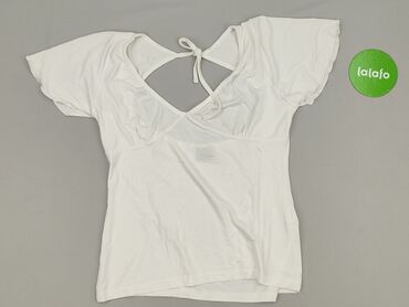 Bluzka damska F&F - Kolor: biały z czarnym, kontrastowym pasem u dołu - Fason: luźny, lekko dłuższy, z krótkim rękawkiem - Dekolt: z przodu okrągły; z tyłu efektowne wycięcie z geometrycznymi pask...Stan: