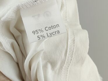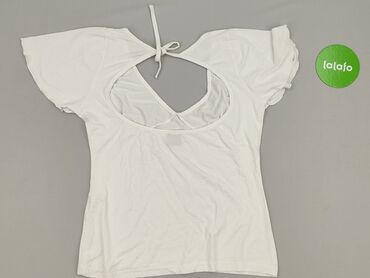Bluzka damska F&F - Kolor: biały z czarnym, kontrastowym pasem u dołu - Fason: luźny, lekko dłuższy, z krótkim rękawkiem - Dekolt: z przodu okrągły; z tyłu efektowne wycięcie z geometrycznymi pask...