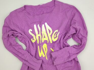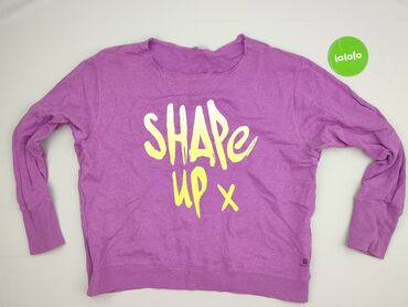 Fioletowa damska bluza z długim rękawem i nadrukiem „SHAPE UP x” z przodu (żółty napis). Luźniejszy, prosty krój z szerokim ściągaczem u dołu i na mankietach, surowo wykończony dekolt typu crew neck. Miękka, średniej grubości dzianina dresowa przyjemna w dotyku. Z tyłu mały żółty detal-grafika pod karkiem. Idealna na trening, codziennie lub do stylizacji casual/athleisure.