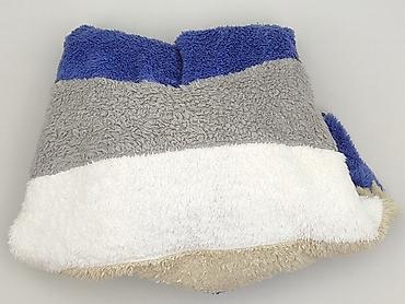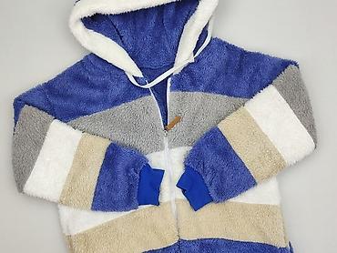 Damska bluza z kapturem, zapinana na suwak, z miękkiego, puszystego materiału „teddy”. Model w szerokie, poziome pasy: niebieski, szary, biały i beżowy.