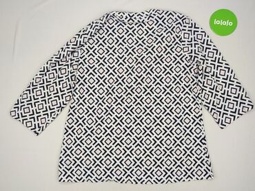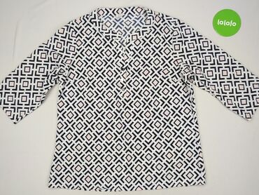 Bluzka damska z delikatnym wzorem - Kolor: biały w drobne, niebieskie krzyżyki/geometrię - Krój: luźny, lekko zaokrąglony dół; rękaw 3/4 - Dekolt: w kształcie litery V z krótką listwą i subtelną l...