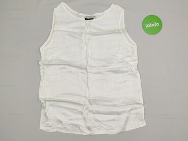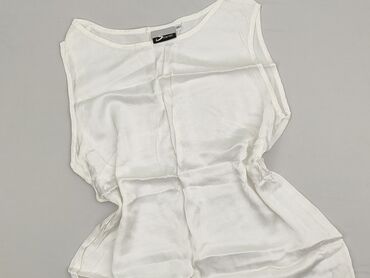 Biała, satynowa bluzka bez rękawów - Krój: prosty, lekko luźny, bez zapięć - Dekolt: okrągły - Materiał: gładka, połyskująca satyna (miękka, śliska w dotyku) - Wykończenie: obszyte lamówki przy de...