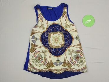 Elegancka bluzka damska bez rękawów w kolorze kobaltowym. - Dekolt łódkowy ozdobiony delikatną taśmą z błyszczących koralików. - Luźny, lejący fason z subtelnymi zakładkami z przodu; dół lekko zao...Stan: