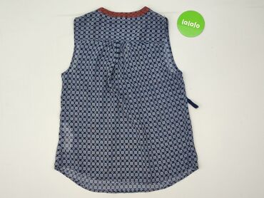 Bez rękawówBluzka damska w odcieniach granatu i bieli, ozdobiona regularnym, geometrycznym wzorem. Dekolt typu V obszyty jest kontrastującą, rdzawoczerwoną lamówką z delikatnymi zdobieniami. Wiązanie na dekolcie dodaje swobodnego charakteru. Materiał bluzki jest lekki i przewiewny, idealny na cieplejsze dni. Dół bluzki jest zaokrąglony. Idealna do stylizacji codziennych, jak i na specjalne okazje, zapewniając komfort i stylowy wygląd. Doskonale pasuje do jeansów, spódnic czy eleganckich spodni.