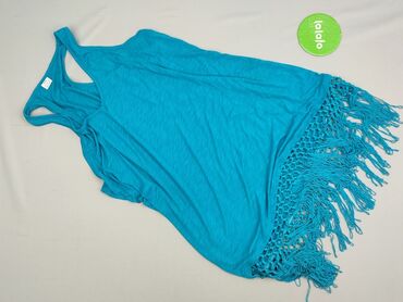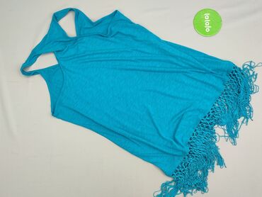 Bez rękawówTurkusowa bluzka damska bez rękawów z dekoltem w kształcie litery V, idealna na upalne dni. Bluzka posiada ramiączka typu racerback, zapewniające swobodę ruchów. Dół bluzki jest ozdobiony szerokimi, plecionymi frędzlami, co nadaje jej unikalny, wakacyjny charakter. Lekki i przewiewny materiał sprawia, że jest to doskonały wybór na plażę, letnie spacery czy casualowe spotkania. Bluzka w rozmiarze M, odpowiednia dla kobiet ceniących sobie komfort i modny wygląd.