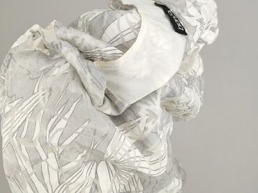 Biała bluzka damska bez rękawów z dekoltem w serek. Luźny, prosty krój z krótkimi opadającymi rękawkami i rozcięciami po bokach u dołu. Przód zdobi nadruk w odcieniach szarości: kwiaty i koronkowe ...