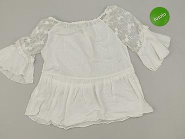 Biała bluzka damska z krótkim rękawem - Fason: luźny, oversize; lekko opadające rękawy - Dekolt: w kształcie litery V z krótką stójką - Materiał: 100% poliester (metka na zdjęciu) - Rozmiar z metk...