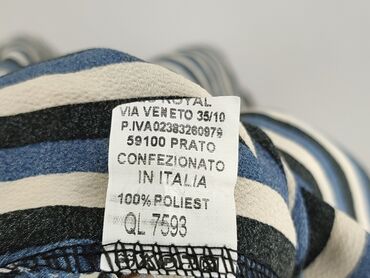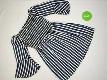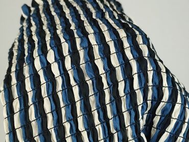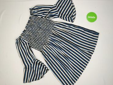 Bluzka damska w paski biało‑błękitne, hiszpanka. - Krój: odkryte ramiona z szerokim karczkiem, luźny dół, krótszy przód i lekko wydłużony tył. - Rękawy: krótkie, z szerokimi mankietami. - Zapięcia...