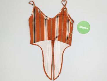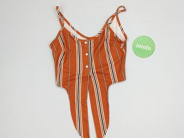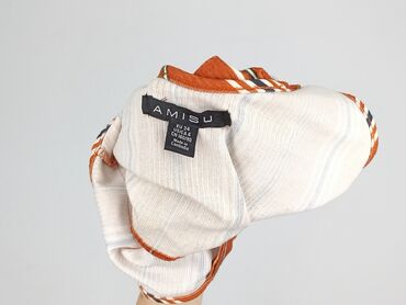 Bez rękawówTa damska bluzka cropped marki Amisu to stylowy wybór. Ma odcień spalonej pomarańczy z białymi i czarnymi pionowymi paskami. Wykonana z lekkiego materiału z dekoltem w kształcie litery V i cienkimi ramiączkami, bluzka jest zapinana na guziki z przodu. Krój cropped i wiązanie z tyłu dodają jej oryginalnego charakteru, idealnego na letnie dni lub jako element warstwowej stylizacji. Rozmiar z metki to EU 34.