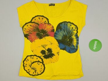 Bluzka damska z krótkim rękawem, w jasnym żółtym kolorze, ozdobiona wzorem w kwiaty i liście w odcieniach szarości i zieleni. Dekolt jest okrągły, a materiał wydaje się lekki i przewiewny, idealny ...Stan: