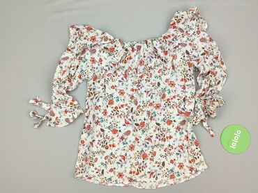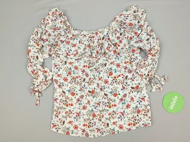 Bluzka damska z odkrytymi ramionami (hiszpanka) w biało‑niebieski, kwiatowy wzór. - Rozmiar: L (etykieta: WOMEN L) - Krój: luźny, z elastyczną gumką wokół dekoltu/ramion; krótkie, delikatnie falow...