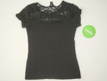 Czarna bluzka damska z krótkim rękawem, rozmiar M (EUR/US/CN/MX M – na metce 170/96A). - Fason: dopasowany, okrągły dekolt - Detale: szeroki pas koronkowych aplikacji z przodu z wykończeniem w pó...