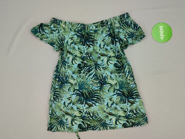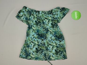 Bluzka damska z lekkiej, półprzezroczystej tkaniny w żywy, roślinny wzór (turkus, zieleń, fiolet, limonka). - Krój: luźna góra z elastycznym dekoltem typu carmen/łódką (można nosić klasycznie lub ...Stan: