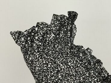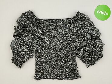 Bluzka J&X w drobny kwiatowy wzór (czarno‑biały) - Fason: dopasowany w talii dzięki elastycznym, marszczonym panelom (smoking). Dół z falbanką. - Dekolt: szeroki, można nosić klasycznie lub opuszc...