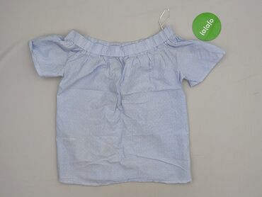 Bluzka damska w paski biało‑błękitne, hiszpanka. - Krój: odkryte ramiona z szerokim karczkiem, luźny dół, krótszy przód i lekko wydłużony tył. - Rękawy: krótkie, z szerokimi mankietami. - Zapięcia...